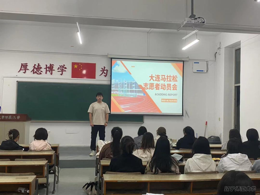 10月15日,志愿者们在文科楼107召开大连马拉松志愿者动员会,执行主席王华东向同学们讲述了在“大马”比赛上的注意事项,提醒志愿者们要做好本职工作,为参赛者提供优质服务,展现属于我们物电澳博