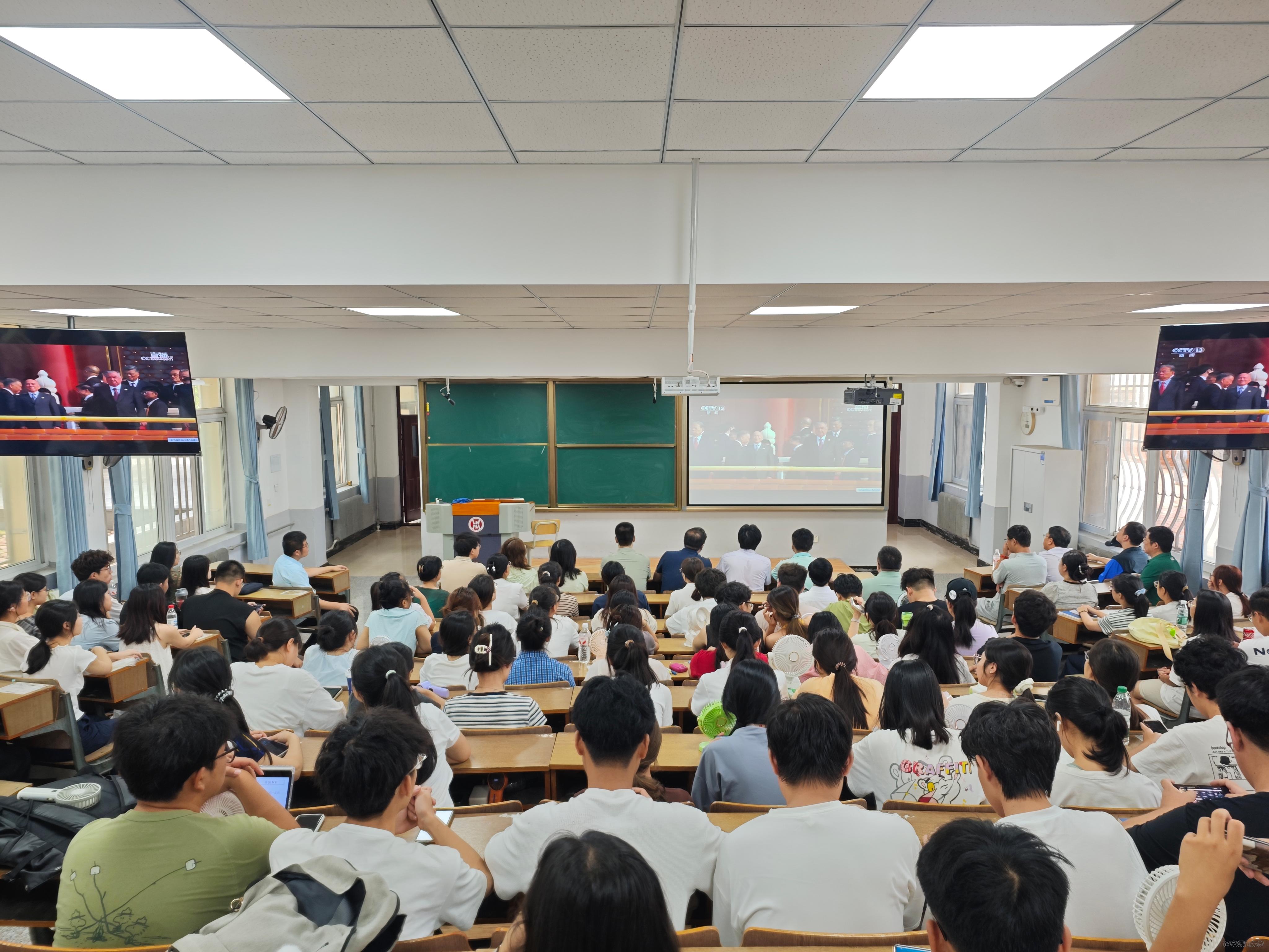 组织部分在校教师以及学生代表在外语楼第二合堂教室共同观看直播,激发师生爱国热情,现场气氛庄重热烈。