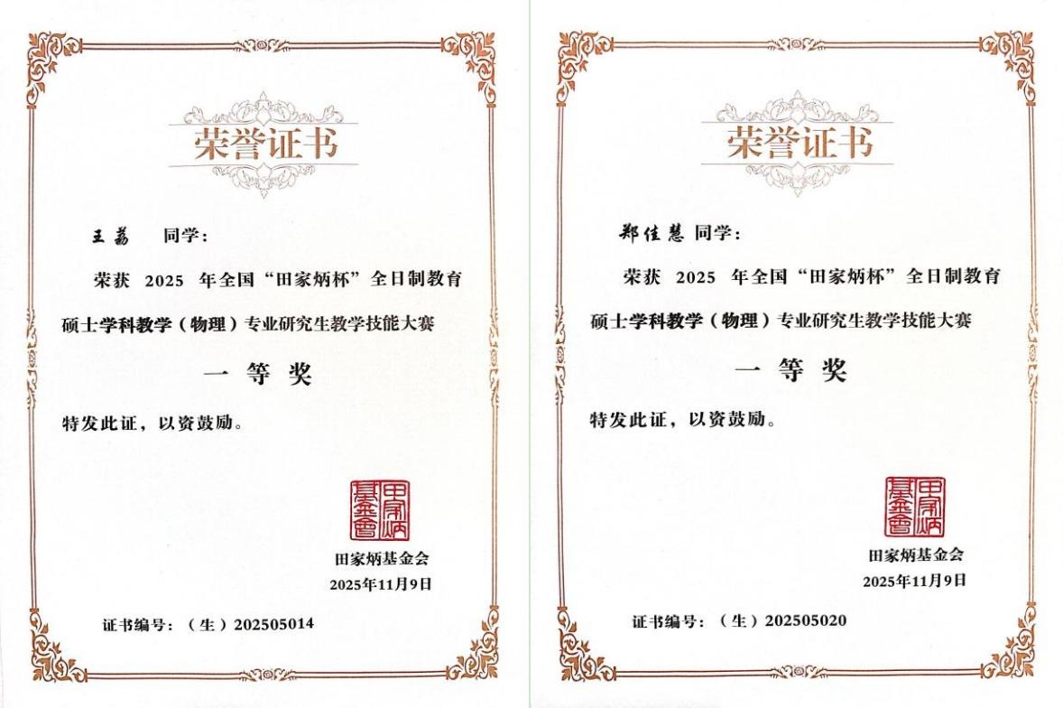 2024级学科教学(物理)专业研究生郑佳慧、王荔双双荣获国家级一等奖,王震、杨硕两名教师获评“优秀指导教师”。
