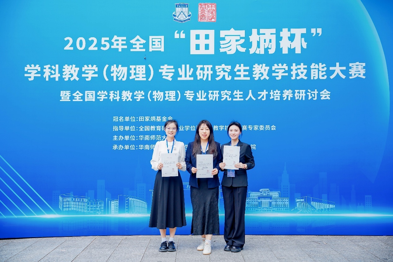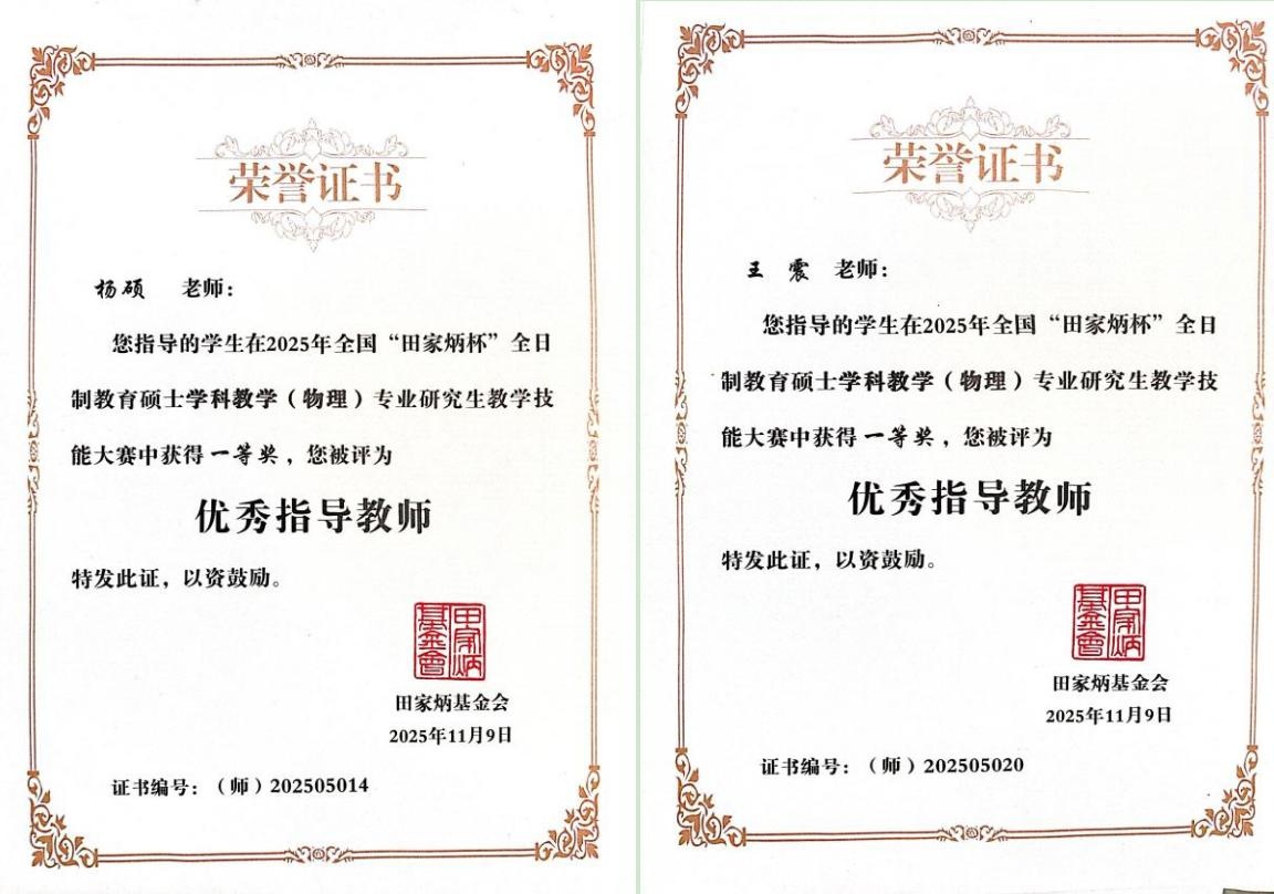 2024级学科教学(物理)专业研究生郑佳慧、王荔双双荣获国家级一等奖,王震、杨硕两名教师获评“优秀指导教师”。